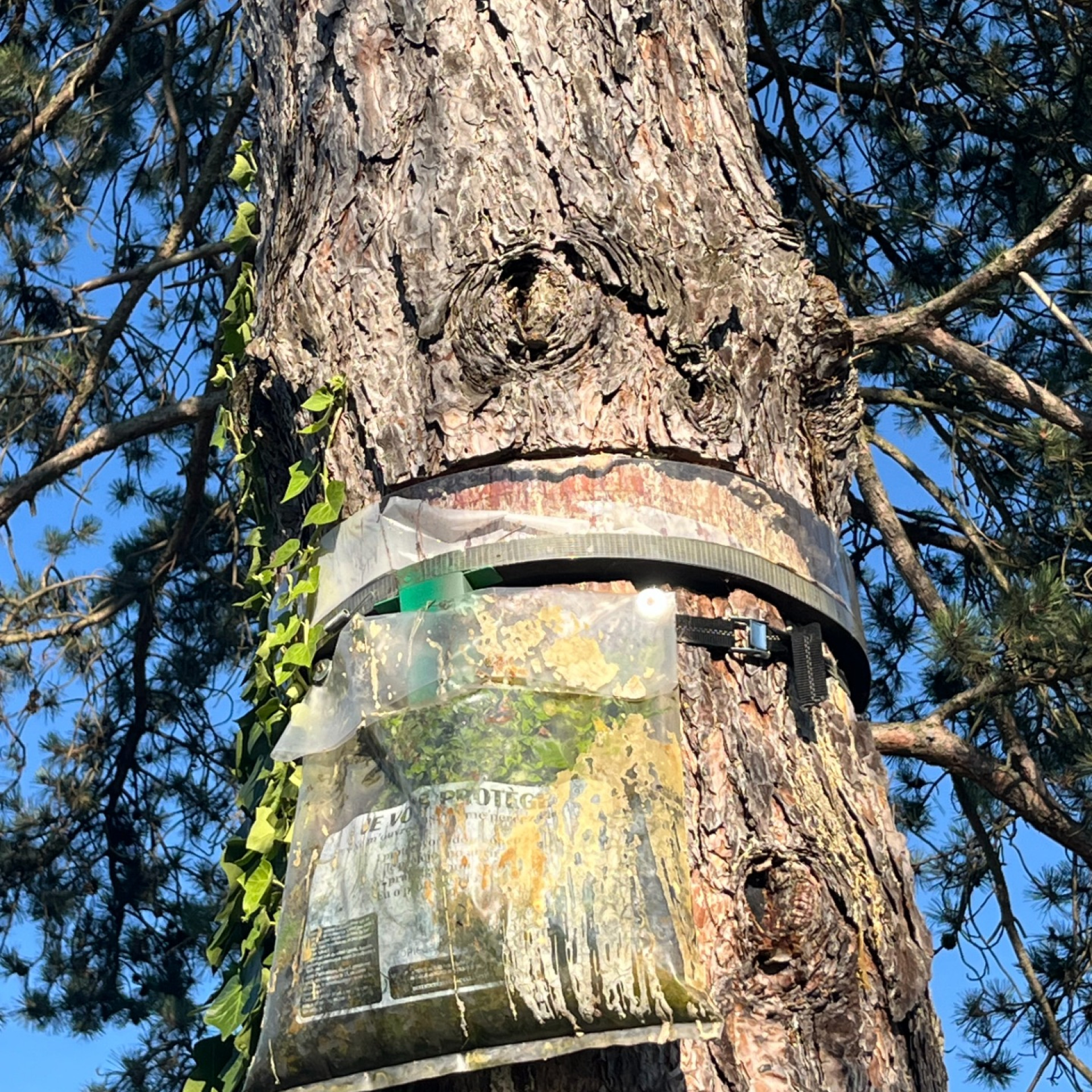 Nous sommes intervenus pour l’abattage d’un pin sec, dont la mort avait été causée par un piège à chenilles processionnaires mal installé. L’écorce avait été creusée pour l’installation du piège, ce qui a affaibli l’arbre au fil du temps.